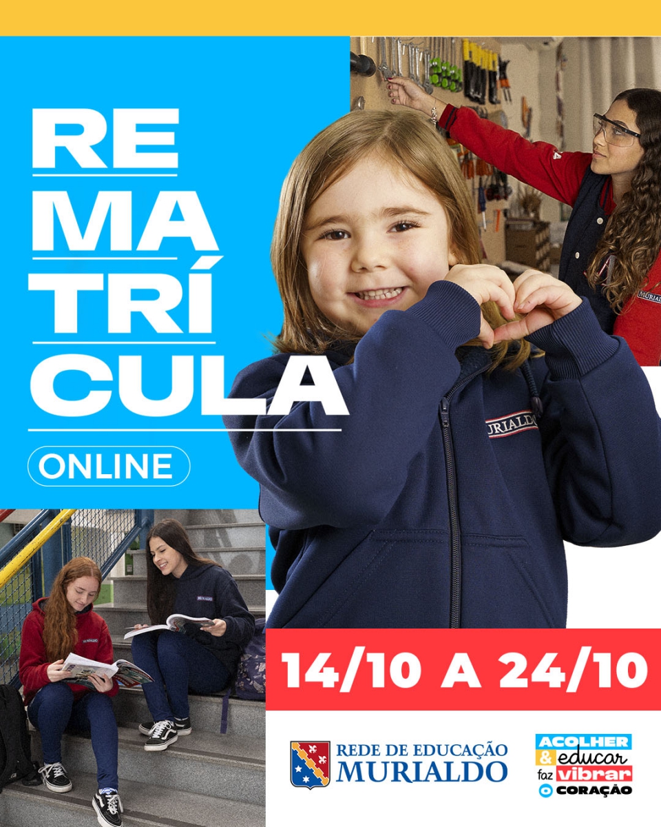 A Rede Murialdo de Educação informa que o processo de rematrículas para 2026 inicia hoje, 14 de outubro, e segue até 24 de outubro de 2025, de forma online, por meio do Portal de Rematrículas.