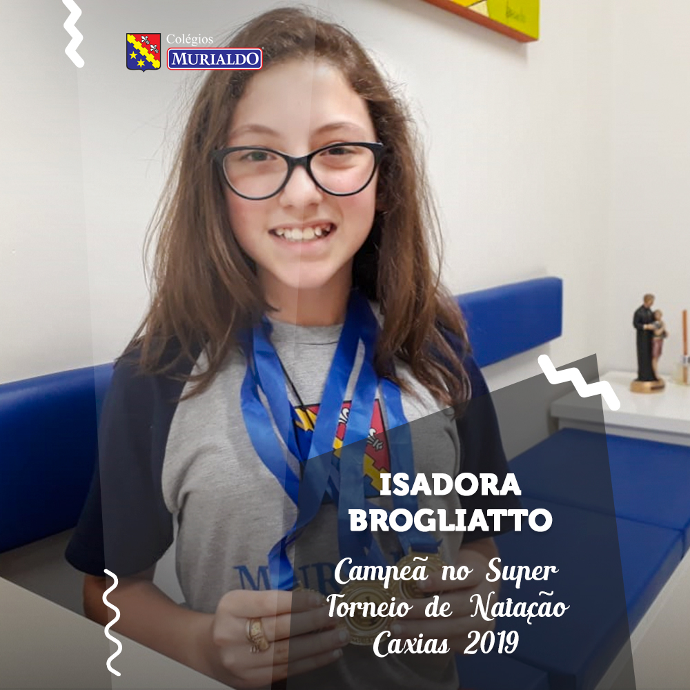 A estudante Isadora Brogliatto da turma 55, do Colégio Murialdo, foi destaque no Super Torneio de Natação Caxias 2019. A jovem conquistou o primeiro lugar em três categorias de 25m: costas, peito e crawl, entre 10 e 11 anos. A competição ocorreu no último sábado, dia 26 de outubro, na Pranadar.