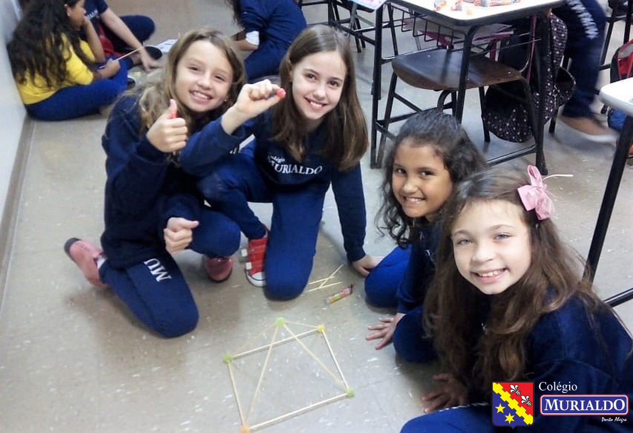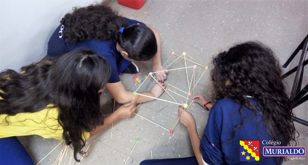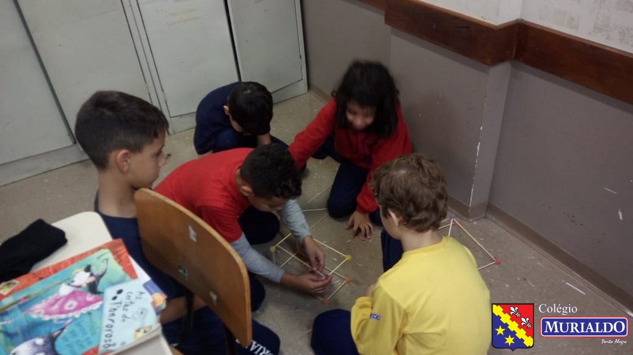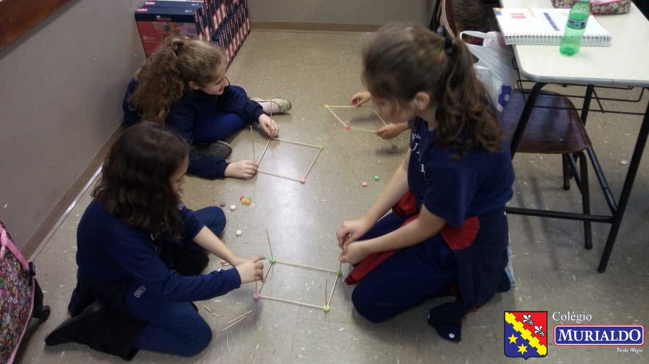 Sob orientação da professora Marjori, os alunos do 4º do Ensino Fundamental I tinha como objetivo construir em sala de aula um paralelepípedo, um cubo e uma pirâmide. Cofira o resultado da atividade, que foi realizada com apenas dois itens: palitos de churrasco e balas de goma.