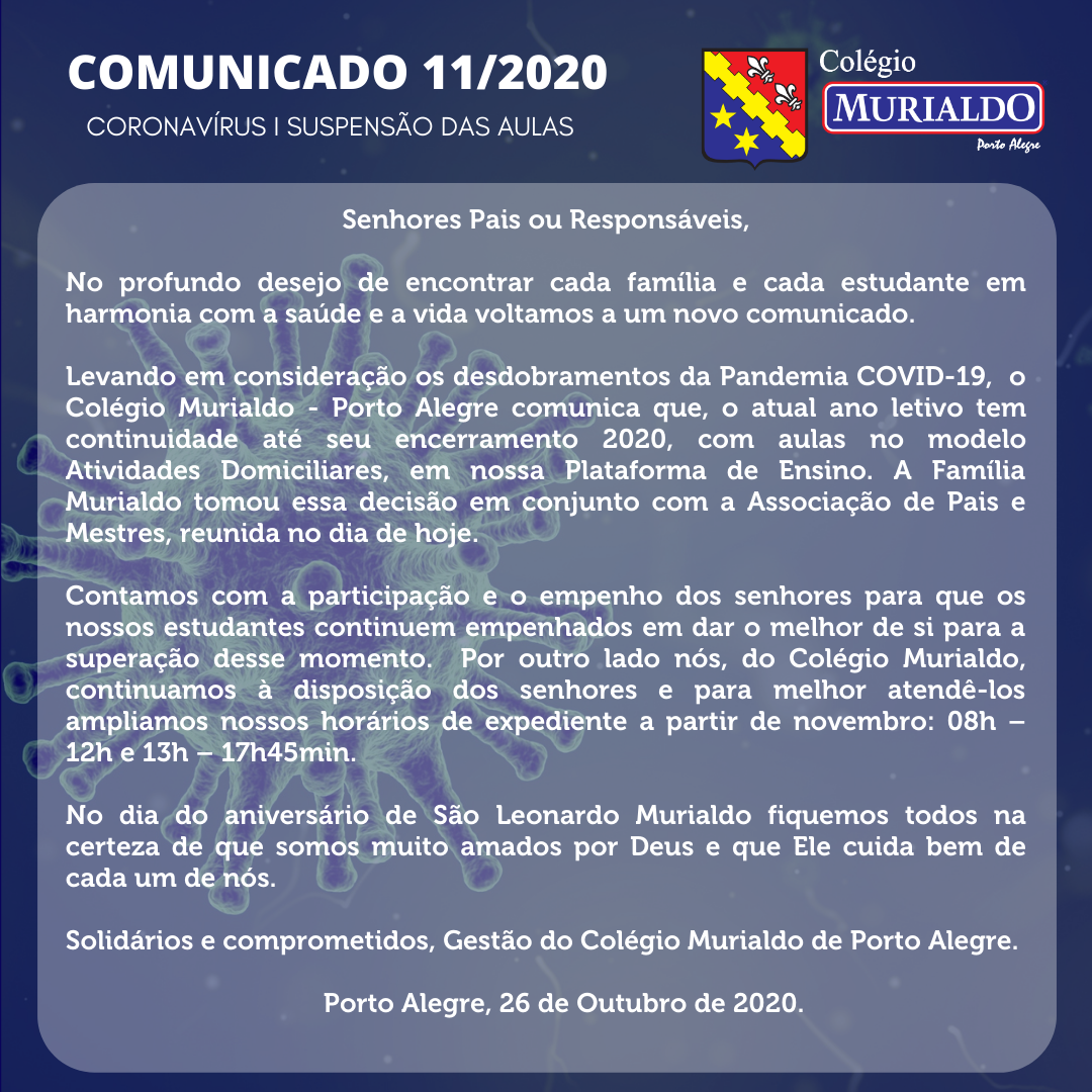 Levando em consideração os desdobramentos da Pandemia COVID-19, o Colégio Murialdo - Porto Alegre comunica que, o atual ano letivo tem continuidade até seu encerramento 2020, com aulas no modelo Atividades Domiciliares, em nossa Plataforma de Ensino. A Família Murialdo tomou essa decisão em conjunto com a Associação de Pais e Mestres, reunida no dia de hoje.