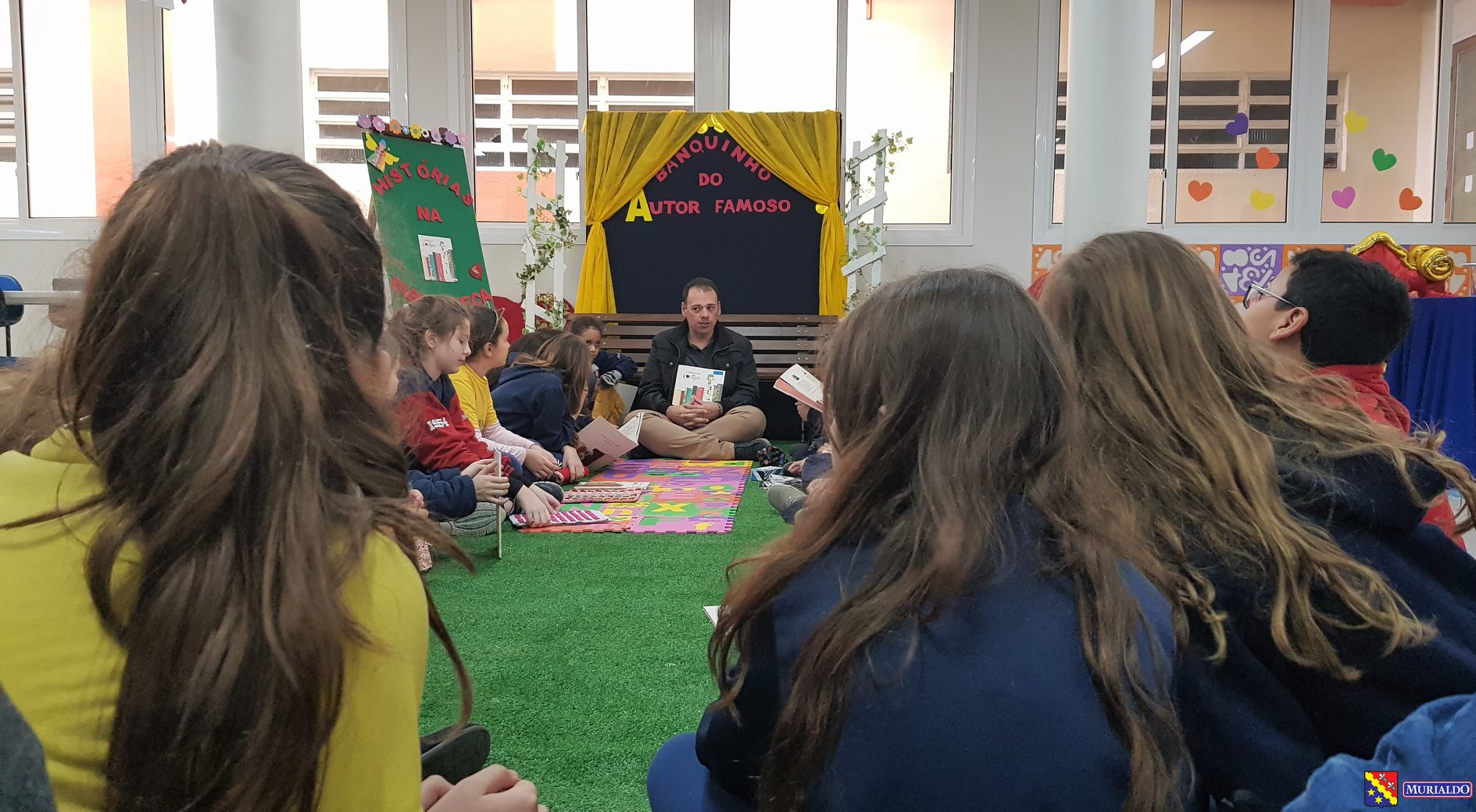 Dando continuidade ao projeto "Sobre Os Ombros De Gigantes, Nossas Crianças Crescem", hoje - 03 de julho - as turmas do 4º ano do Ensino Fundamental I receberam a visita do autor Fabio Monteiro. No "Banquinho do Autor Famoso", Fábio conversou com as turmas 41, pela manhã, e 42 e 43 à tarde, sobre o livro "A Menina Que Contava". Alga, a personagem principal da obra, adorava contar. Contava os números, as horas, os botões, até que um dia, também começou a contar histórias.