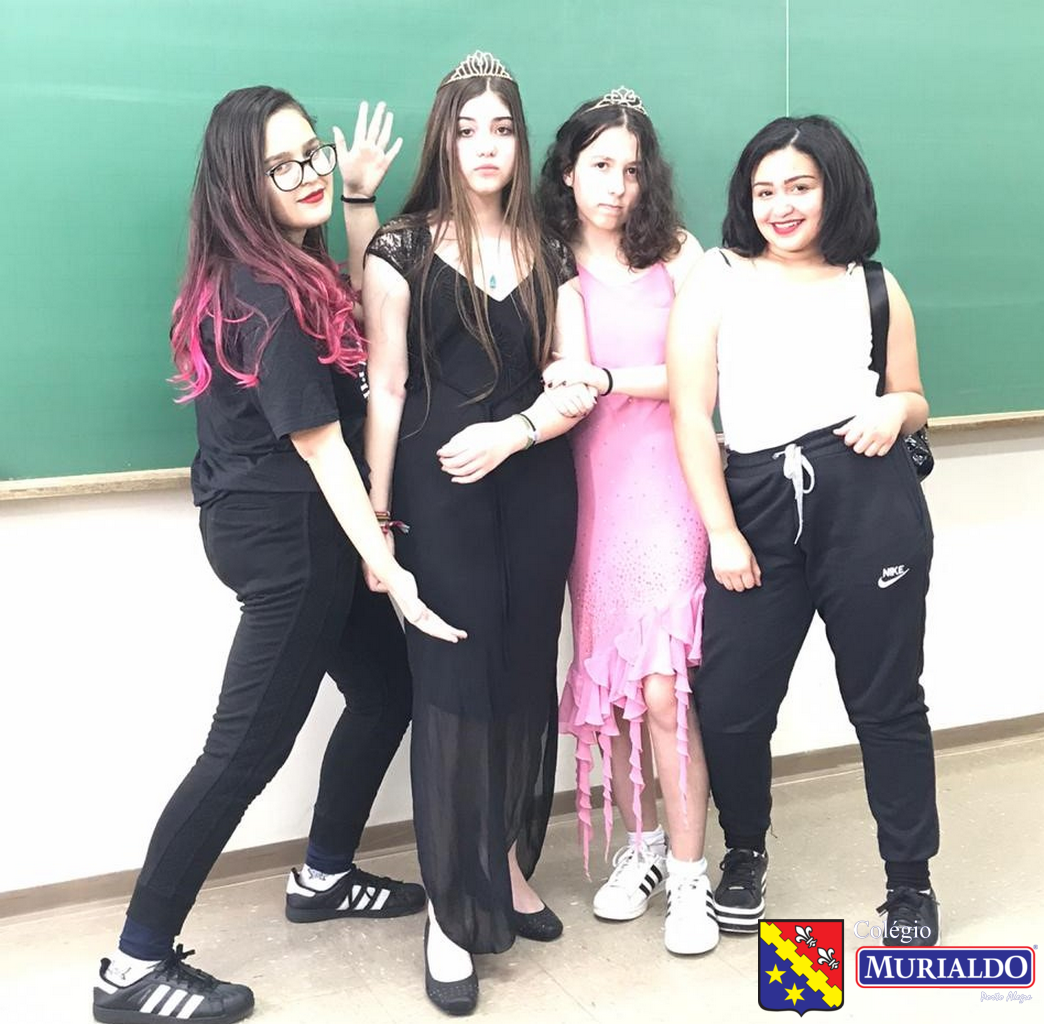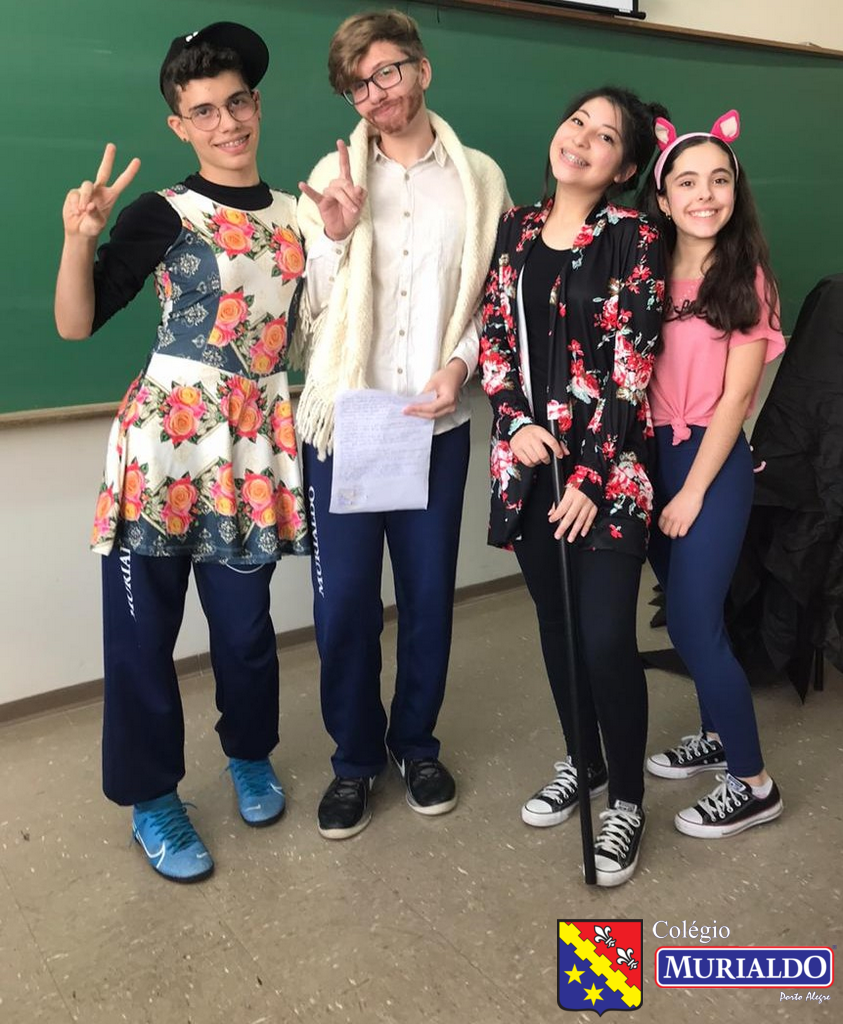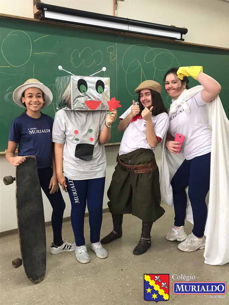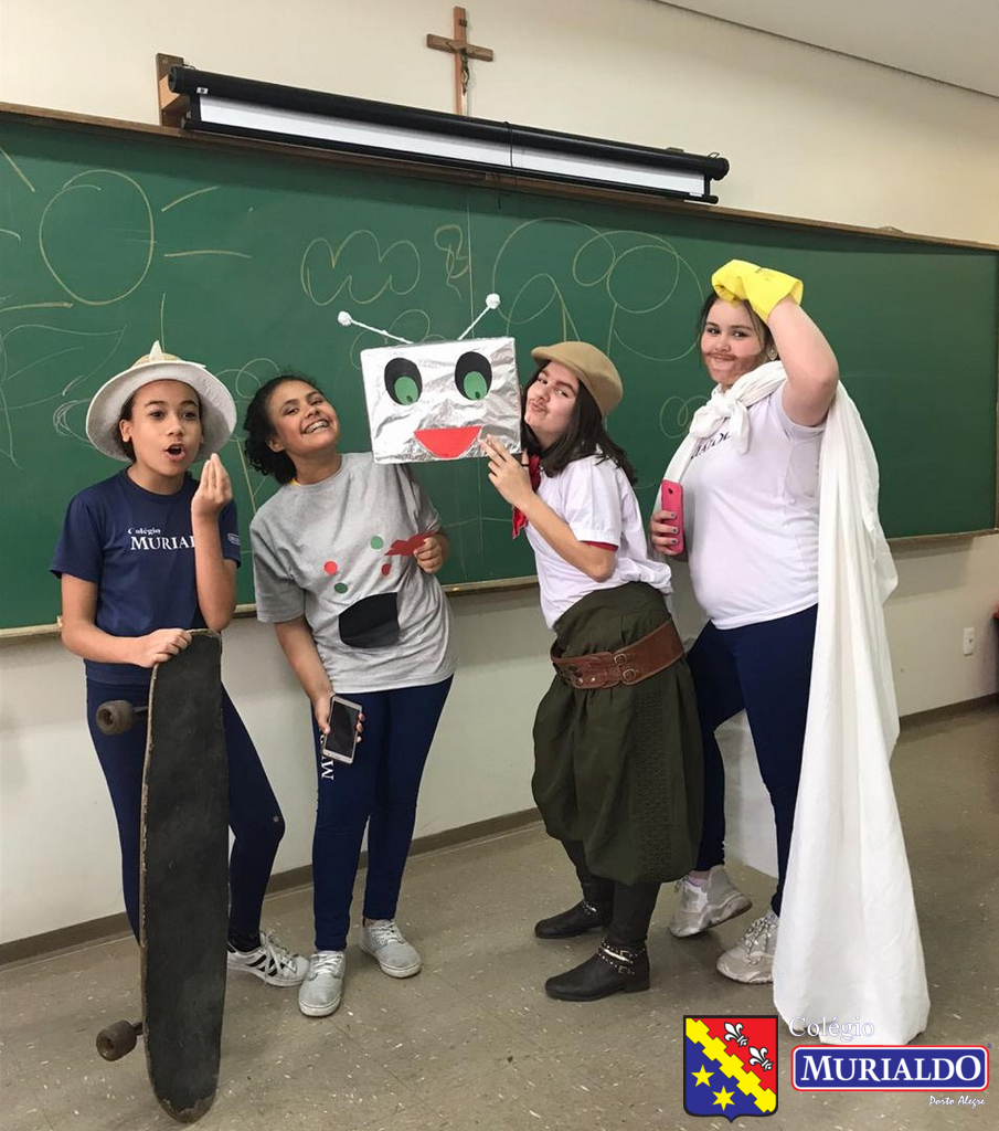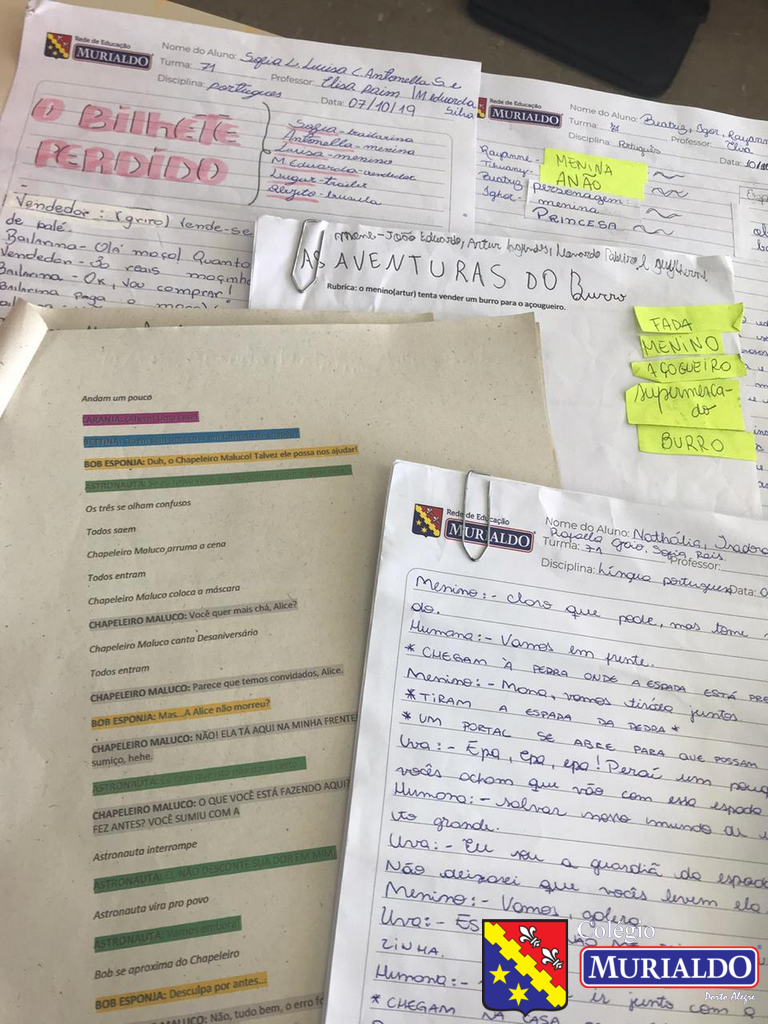 Depois, foi a hora de produzirem aquela SUPER história e transformá-la em um roteiro de teatro - gênero textual estudado em aula- teve até uma laranja, o Bob esponja, um astronauta e um chapeleiro maluco passeando por aí.