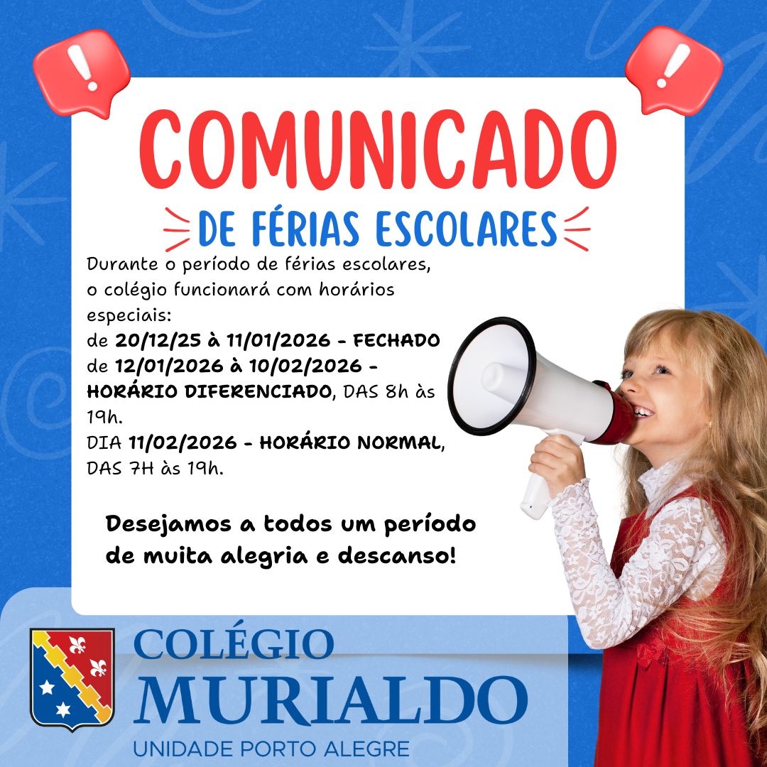 Durante o período de férias escolares, o Colégio estará funcionando em um horário diferenciado.