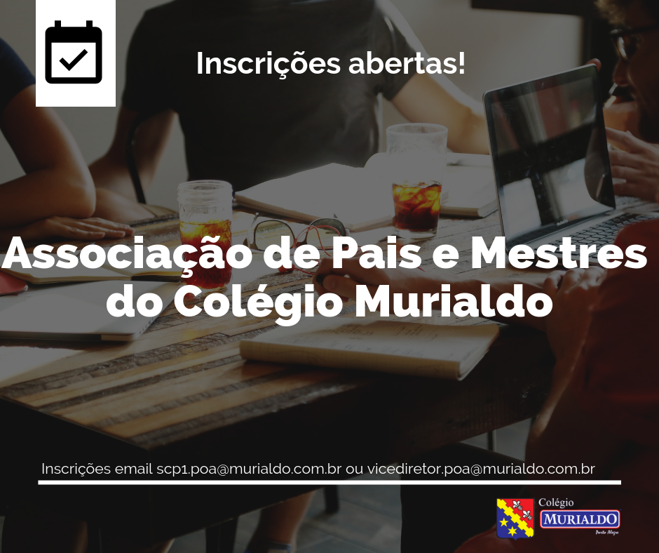 A direção do Colégio Murialdo comunica que está estruturando a formação da Associação de Pais e Mestres do Colégio Murialdo de Porto Alegre - APAMEMUR - POA. Haverá a eleição da nova diretoria no dia 11 de maio de 2019, no periodo da manhã. As inscrições estarão abertas até o dia 3.5.2019 e podem ser realizadas pelos e-mails vicediretor.poa@murialdo.com.br ou scp1.poa@murialdo.com.br.