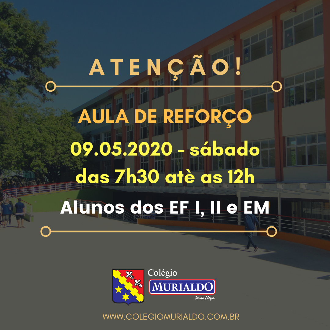 No próximo sábado, dia 9 de maio, das 7h30 até o meio dia, o Colégio Murialdo irá disponibilizara aulas de reforço aos seus alunos do 1º ano do Ensino Fundamental até o 3º do Ensino Médio.