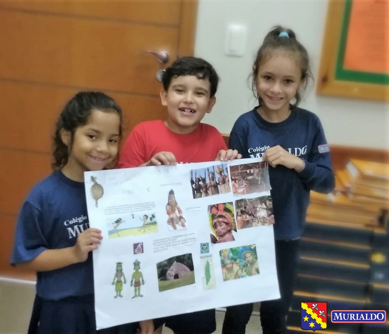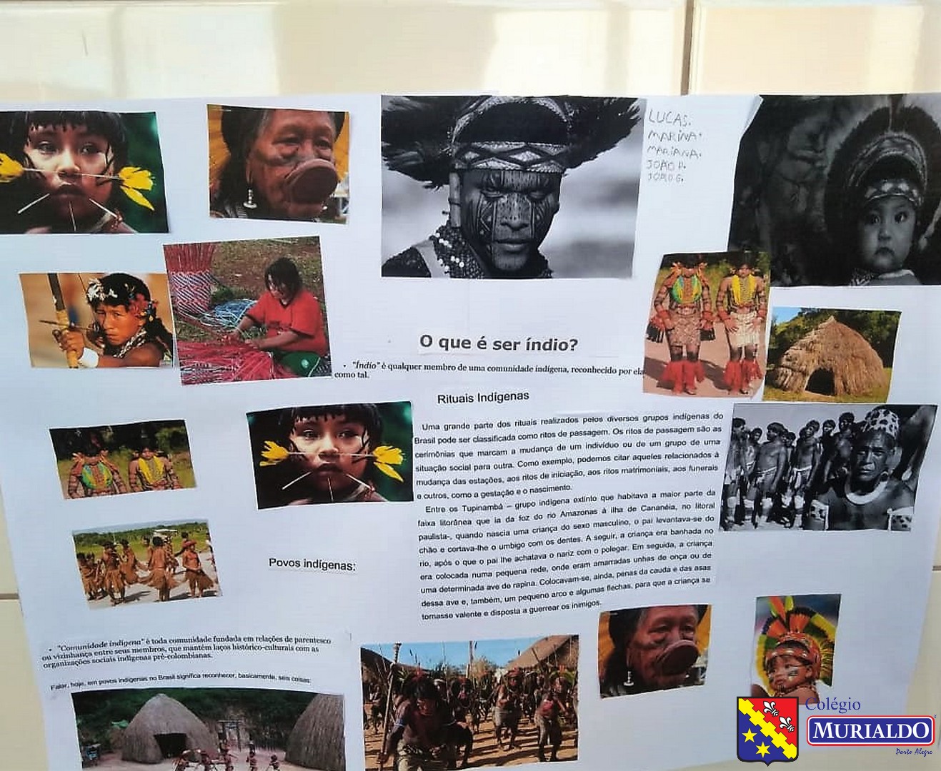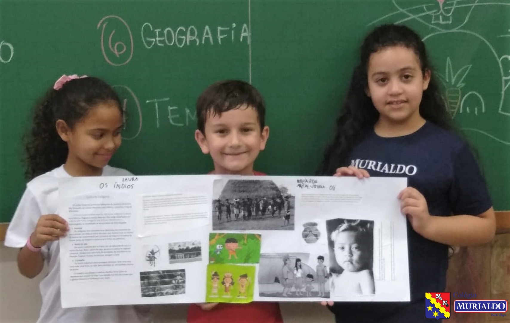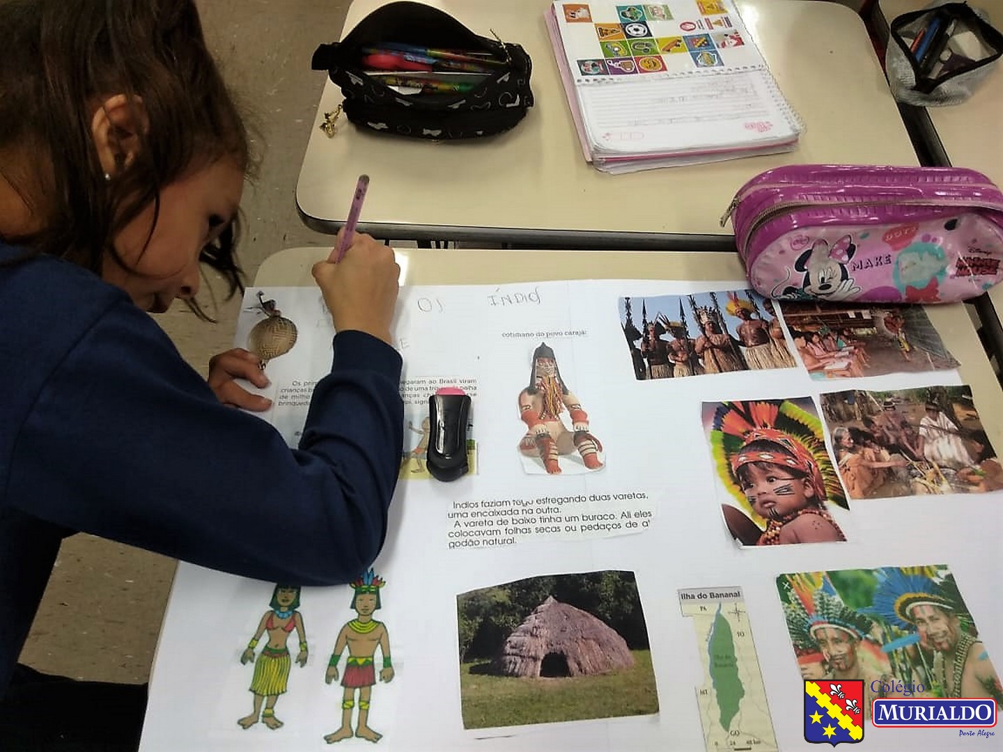 Após fazerem as pesquisas em casa com suas famílias, as crianças se dividiram em grupos para comporem os cartazes com imagens e textos sobre a história dos povos indígenas no Brasil.