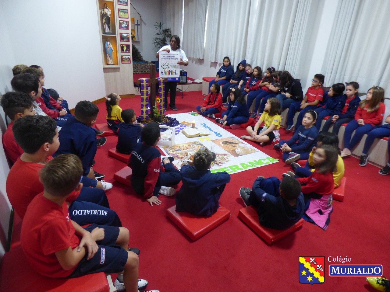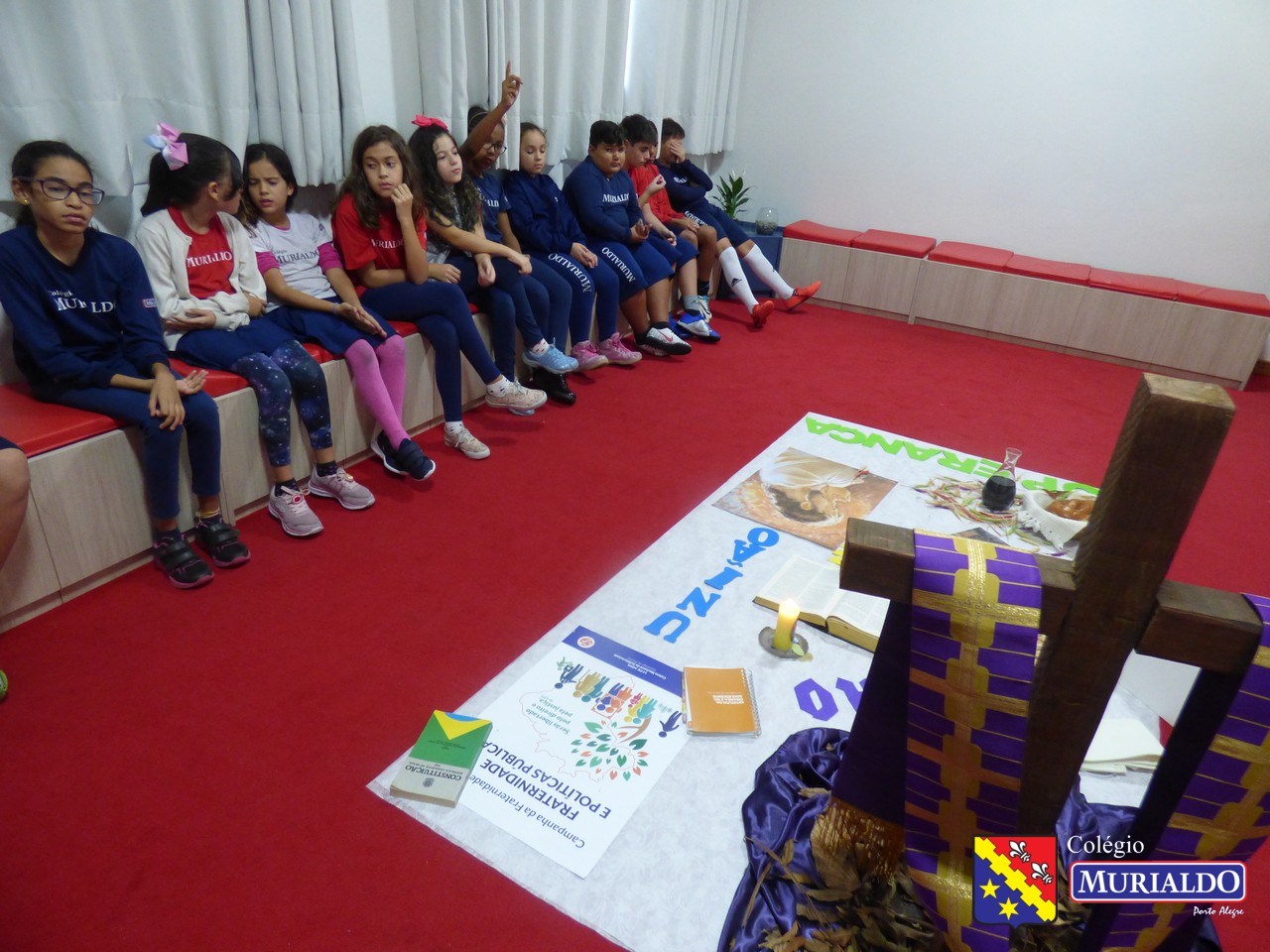 Vivenciado a Semana Santa, os alunos do ensino fundamental 1 (1º ao 5º ano) participam de um momento de reflexão e espiritualidade sobre a Páscoa de Jesus. A atividade é dinamizada pela Pastoral Escolar.