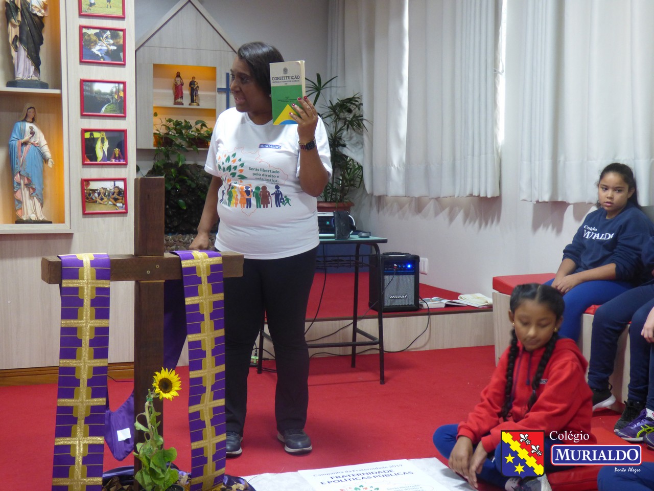 A professora Olga Helena trouxe alguns símbolos que ajudam a pensar a páscoa como passagem para um novo estilo de vida, entre eles, o cartaz da Campanha da Fraternidade, que neste ano debate as políticas públicas, a cruz, o pão e a vela. Também foi feita a apresentação de um pequeno filme sobre a vida de Jesus.