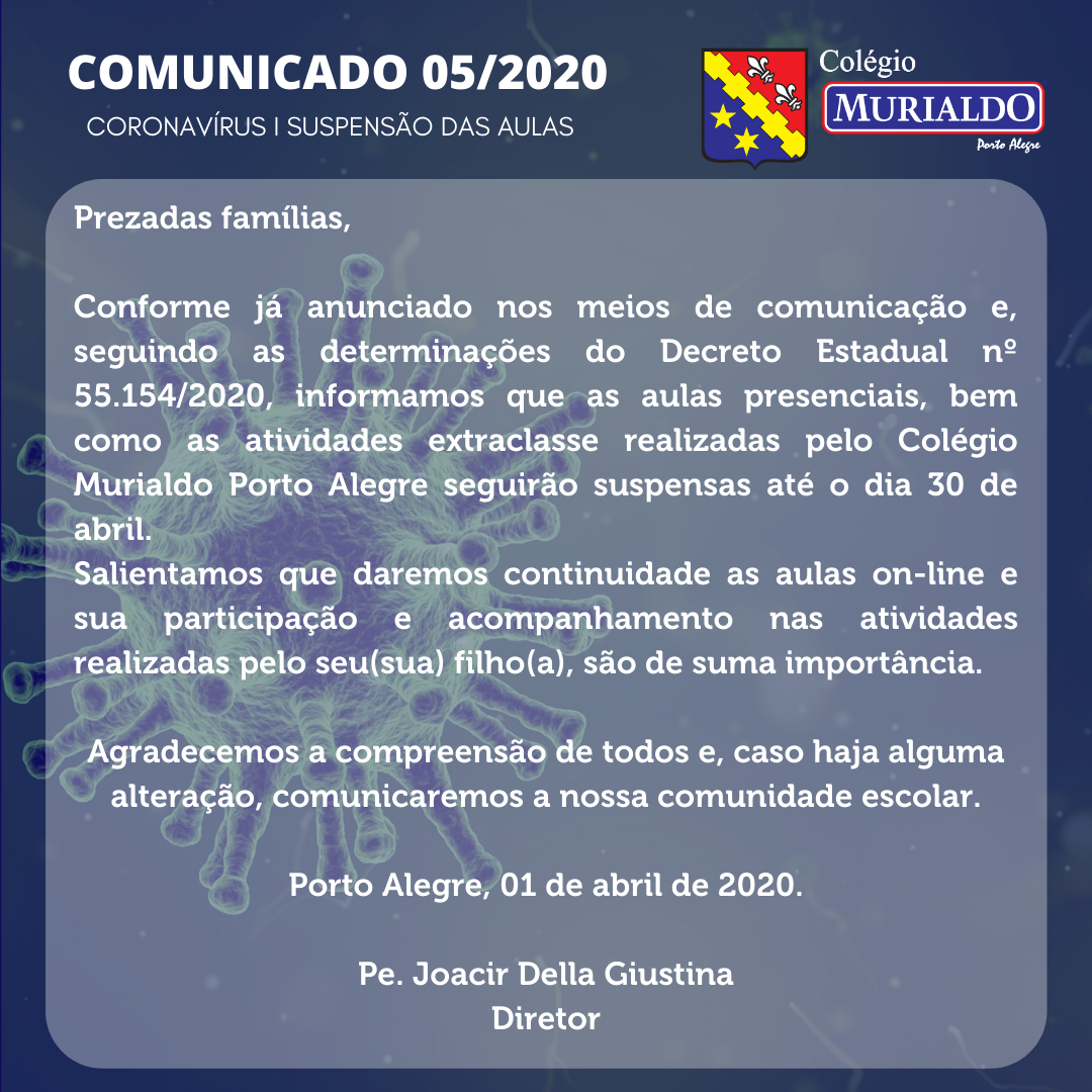 Conforme já anunciado nos meios de comunicação e, seguindo as determinações do Decreto Estadual nº 55.154/2020, informamos que as aulas presenciais, bem como as atividades extraclasse realizadas pelo Colégio Murialdo Porto Alegre seguirão suspensas até o dia 30 de abril.
