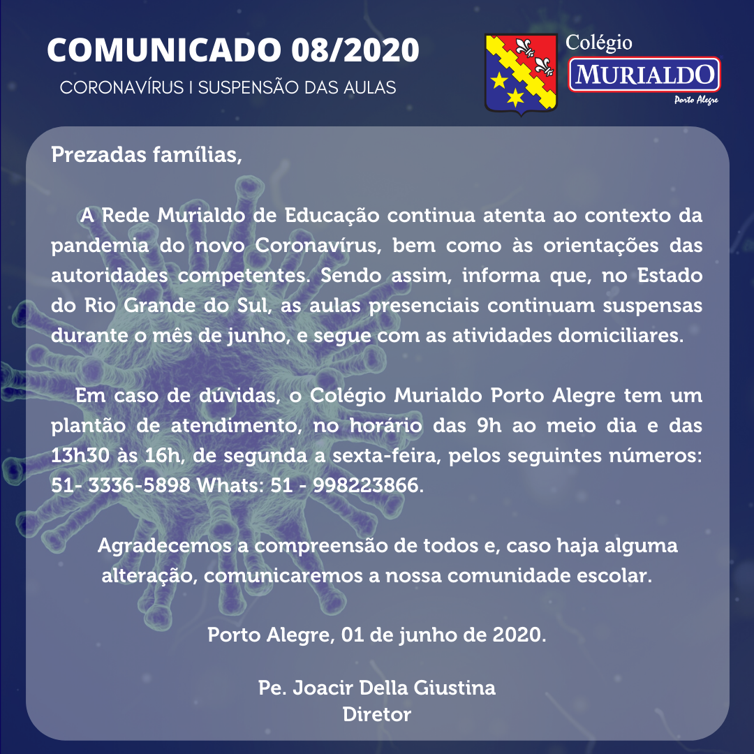 A Rede Murialdo de Educação continua atenta ao contexto da pandemia do novo Coronavírus, bem como às orientações das autoridades competentes. Sendo assim, informa que, no Estado do Rio Grande do Sul, as aulas presenciais continuam suspensas durante o mês de junho, e segue com as atividades domiciliares.