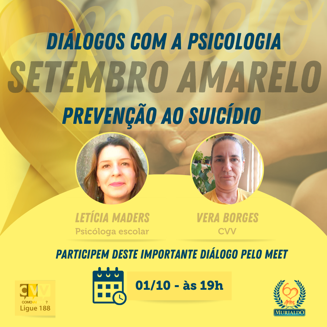 Setembro Amarelo, é uma campanha que ocorre anualmente com o intuito de fazer uma reflexão sobre o suicídio. Segundo a Organização Mundial de Saúde (OMS), no mundo todo, a cada 40 segundos, alguém tira a própria vida, e, uma média de 800 mil mortes ocorrem por ano. Pensando em proporcionar um ambiente de conversa, o Colégio Murialdo de Porto Alegre promoverá no dia 01 de outubro, às 19h, a Live “Diálogos com a Psicologia: Setembro Amarelo - Prevenção ao Suicídio”.